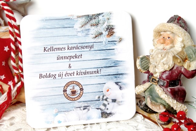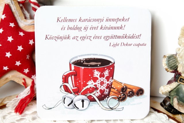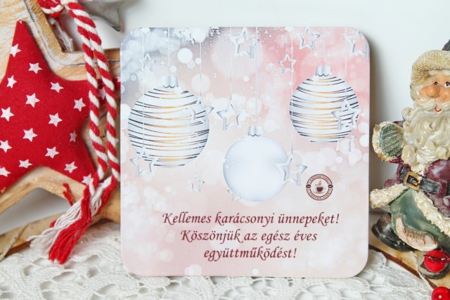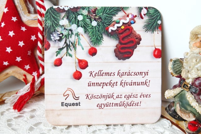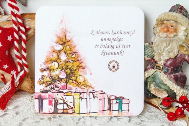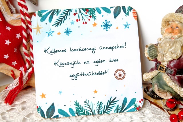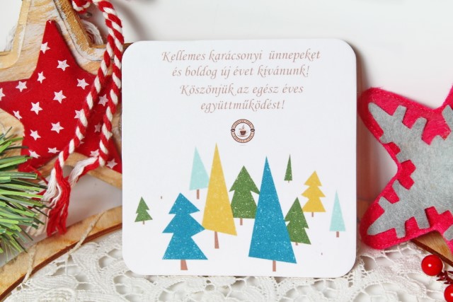 vagy akármilyen ajándékcsomag mellé. A karácsonyi dizájn és a jókívánság szöveg mellett szerepel a cég neve vagy akár a logó is.