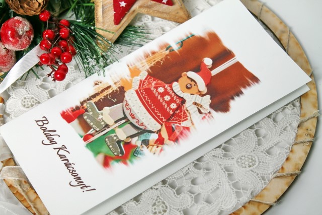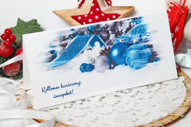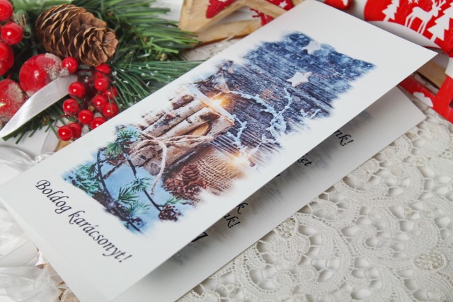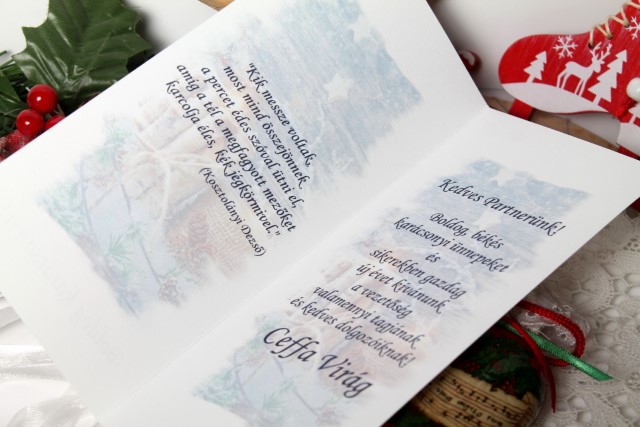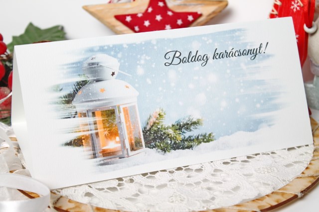 A hajtogatott karácsonyi képeslap mérete 10 X 21 cm, melyhez lehetőség van ugyanolyan kreatív papírból borítékot rendelni.