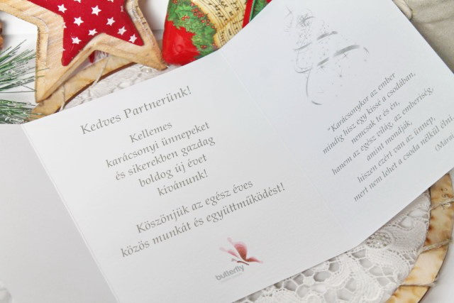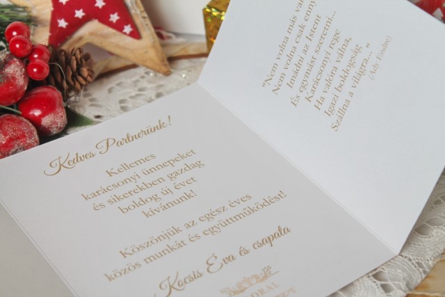 köszönő szövege partnereik felé az év végi jó kívánságokkal együtt, a logó és akár egy rövid karácsonyi idézet kíséretében.